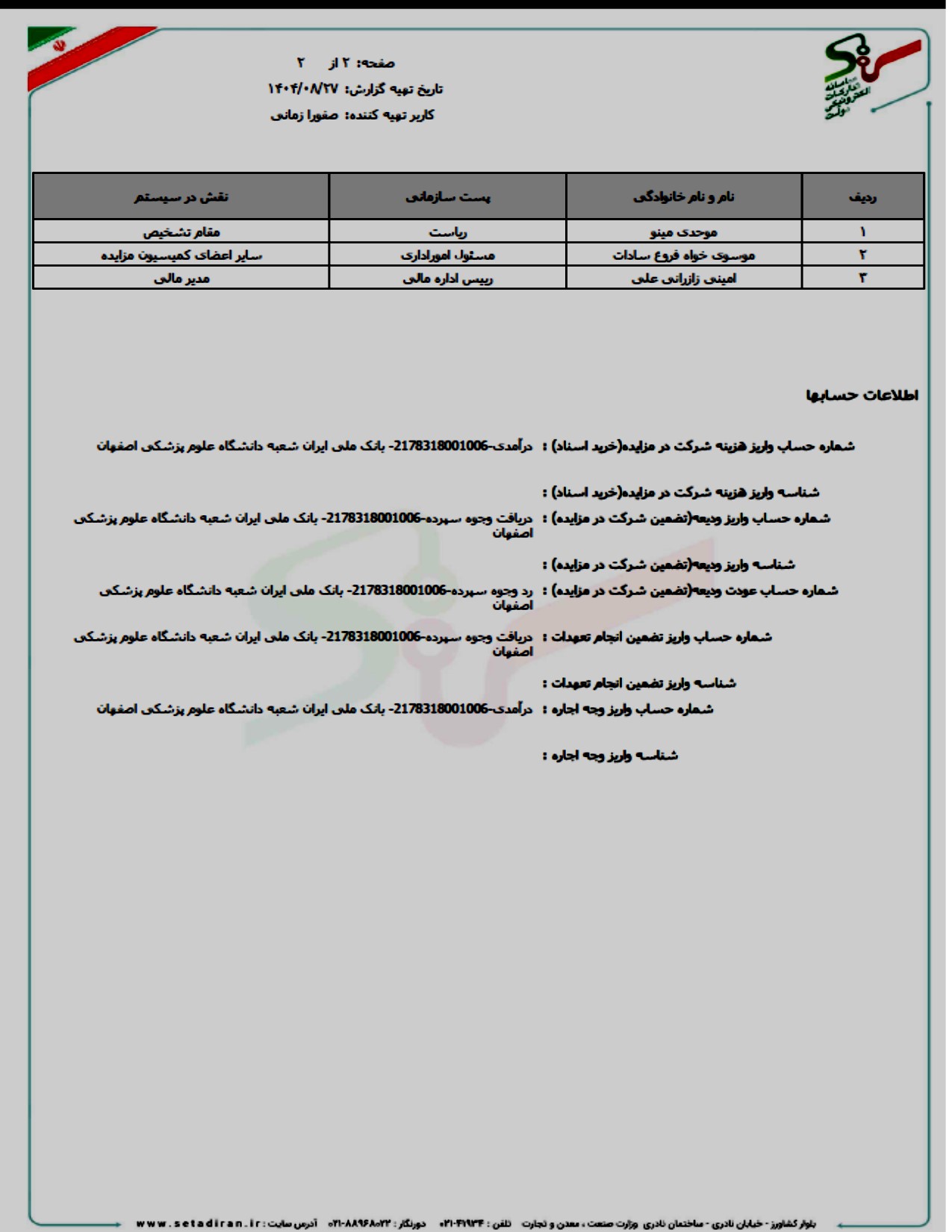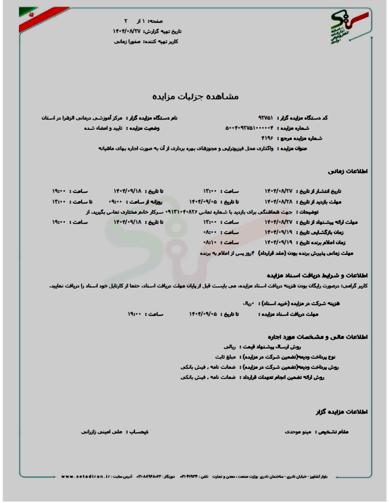 مزایده واگذاری محل فیزیوتراپی و مجوزهای بهره برداری از آن به صورت اجاره بهای ماهیانه مزایده مرکز آموزشی درمانی الزهرا (س)